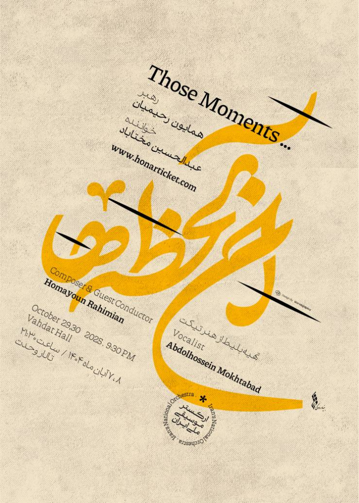 کنسرت «آن لحظهها»؛ اجرای ارکستر موسیقی ملی ایران با رهبری همایون رحیمیان و خوانندگی عبدالحسین مختاباد، چهارشنبه و پنجشنبه، ۷ و ۸ آبان ماه از ساعت ۲۱:۳۰ در تالار وحدت برگزار میشود.