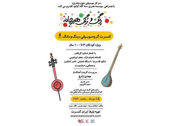 کنسرت گروه موسیقی «دینگ و دانگ» با عنوان «رنگ‌ و رنگِ هیچانه» به سرپرستی آهنگسازی مهدی زارع ویژه کودکان ۳ تا ۱۰ سال پنجشنبه (۱۸ دی ماه) ساعت ۱۹:۳۰ در تالار سوره حوزه هنری به روی صحنه می‌رود.