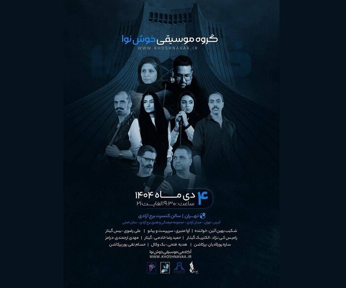 کنسرت گروه موسیقی «خوشنوا» پنجشنبه (۴ دی ماه) از ساعت ۱۹:۳۰ در سالن اصلی برج آزادی به روی صحنه میرود.