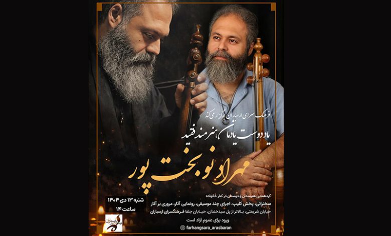 مراسم یادبود مهران نوبختپور، هنرمند فقید عرصه موسیقی ایرانی، به همت فرهنگسرای ارسباران و با حضور جمعی از هنرمندان و علاقهمندان موسیقی روز شنبه ۱۳ دیماه ۱۴۰۴ ساعت ۱۴ برگزار خواهد شد. در این مراسم که با همراهی خانواده و دوستان این هنرمند برگزار میشود، بخشهایی از آثار نوبختپور مرور و همچنین چند قطعه موسیقایی، […]